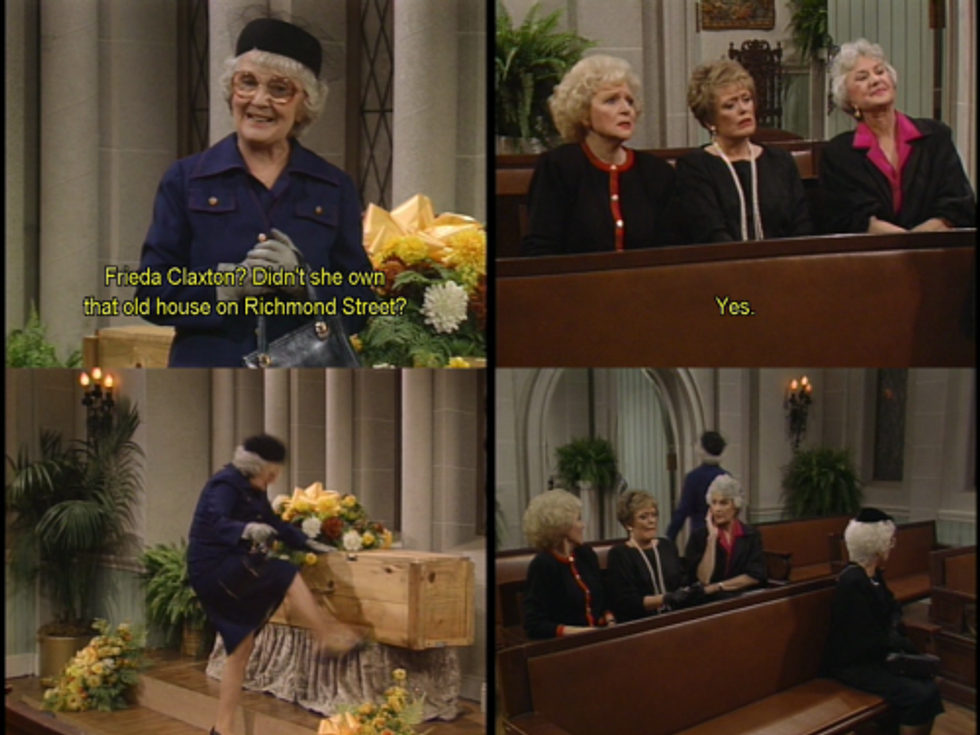The girls are fighting their neighbor to not have a tree cut down on her property. They go tit for tat with each other in court and Rose tells her to drop dead. Which she does.