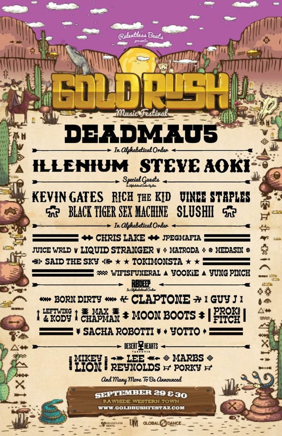 On September 29th and 30th, Relentless Beats turns the everyday rawhide into an amazing western town full of cowboys, horses, and much more. This show is 18+. You will need both your wristband and ID to enter. This show includes headliners Deadmau5, Illenium, and Steve Aoki. Attached is the official lineup video for this year's event.
