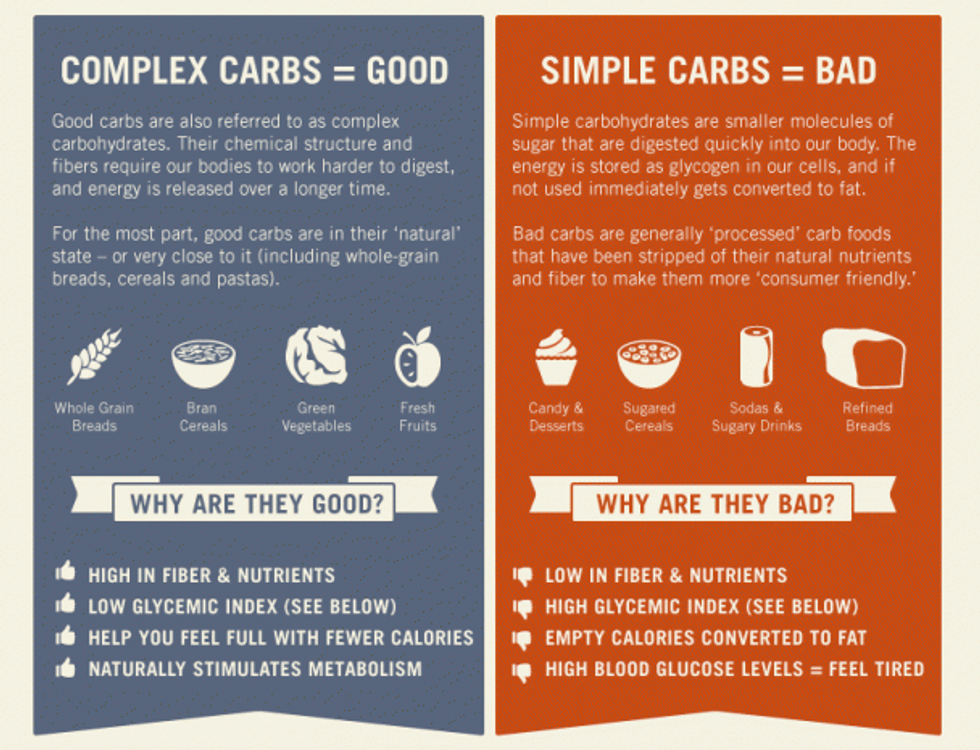 Now, what makes one better or worse than the other? It's actually quite simple. Carbohydrates are put into two categories, simple and complex carbs. You want to eat the complex carbs, and you don't want to eat the simple carbs. Thanks to positivemed, here is a chart to explain.