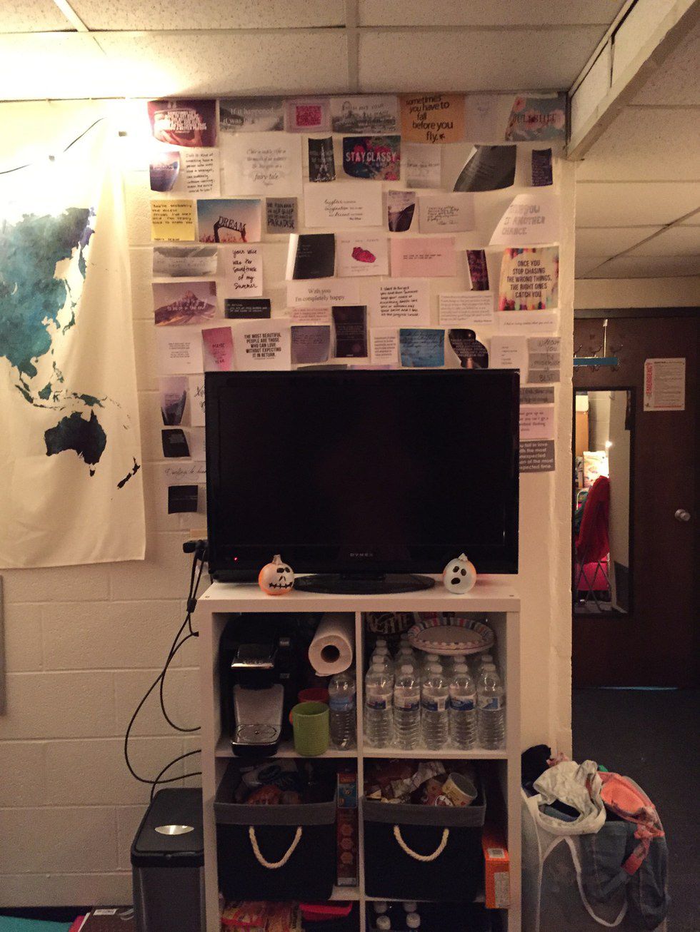 My dorm room was the place I called home for the last 9 months. From the sleepovers, to study dates, to parties to squad meetings, to balling our eyes out in the middle of the night, this room has seen everything. For a room so small and so boring when I moved in, I never would have thought it would end up to be this homey and cozy. My roommate and I hated the cinderblock white walls so we covered as much of it as humanly possible. One time we both had shitty weekends, so we printed out our favorite quotes and hung them up on our "Quote Wall" If you read them, you'd think that a lot of them are sad and depressing, but it shows how .we were feeling that weekend.