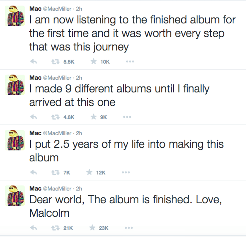 Mac Miller was ready to quit music. During last month’s press tour for his upcoming album, Mac spoke about his most recent project, "Faces" (released in 2014),“"Grand Finale" (last song on the mixtape) was supposed to be the last song I made on earth.” While Mac’s up-and-down relationship with drugs has been in the public eye for years, it shocked fans that he would actually stop making music. With three albums and 11 mixtapes, fans of Mac could always count on a consistent output of music. Although the quality and substance of the music was undoubtedly influenced by the different substances he was taking, Mac was still making music and even dabbling in producing as ‘Larry Fisherman.’