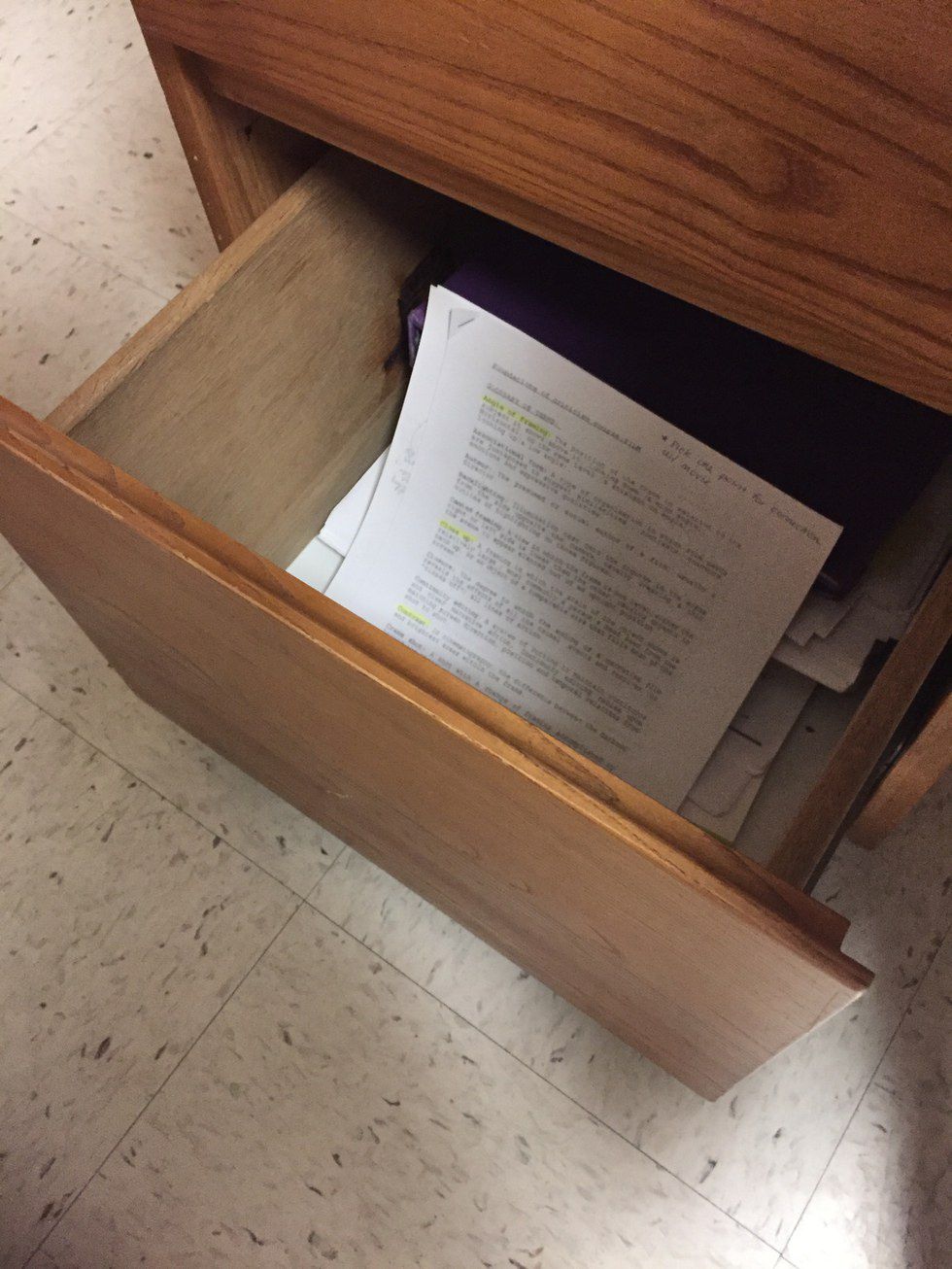 You were incredibly noisy, like a screeching Fury coming after my soul. But you were also among the largest drawers in the room, so you were perfect for keeping my stacks upon stacks of papers safe. Thanks for that, at least.
