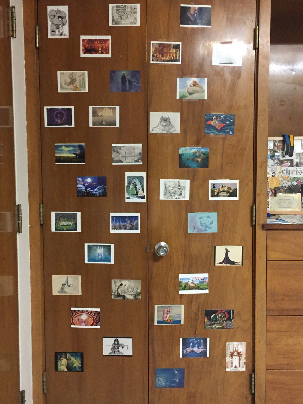 While your inside was pretty full to the brim with clothes and cleaning supplies, your outside sported a nice gridline of some other postcards I got for my last birthday. These postcards, like the ones from the Met, also featured art, but rather art from Disney's animated feature films. My mom got them for me, so I'd always think of her when looking at your double-doors.