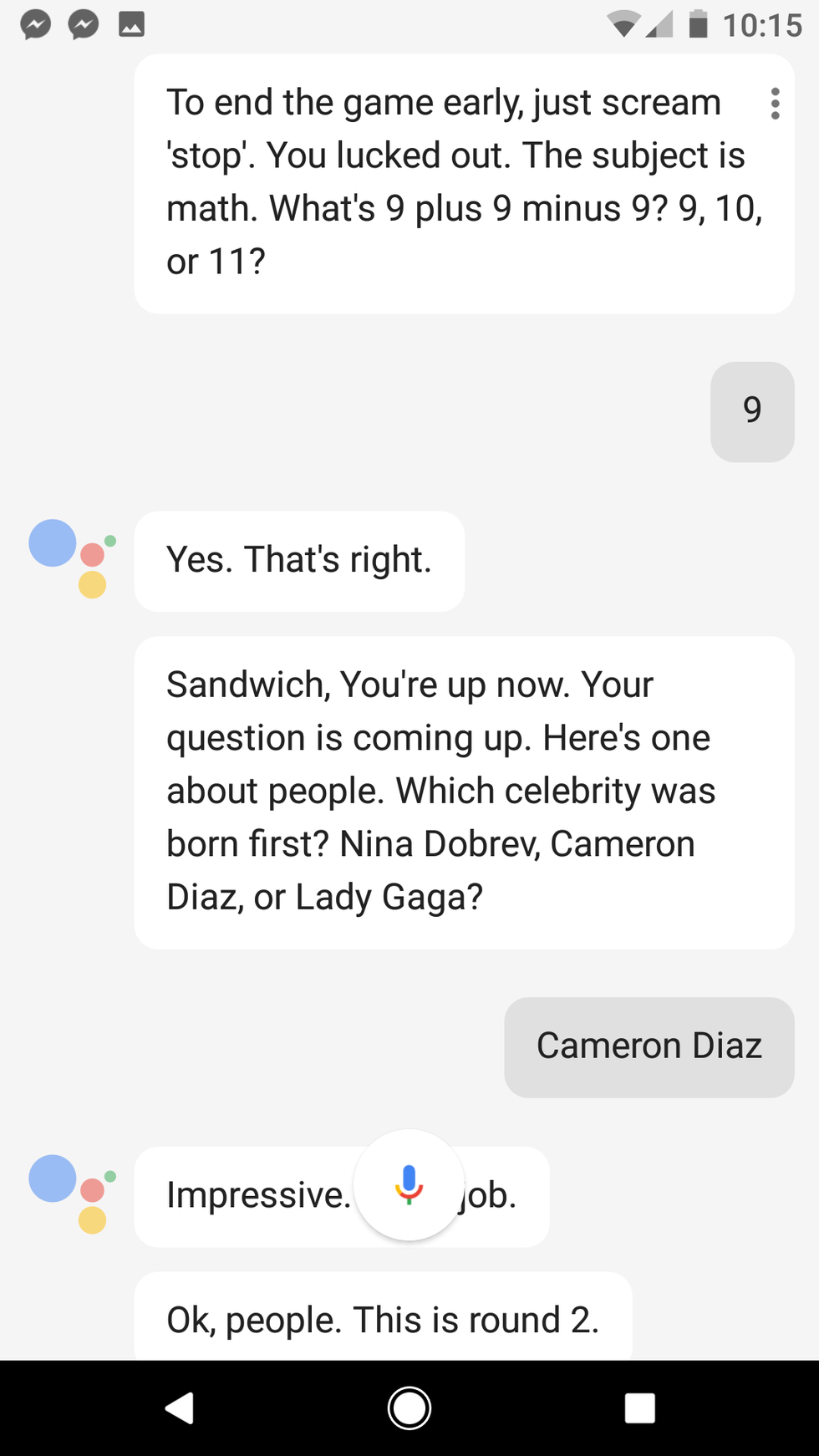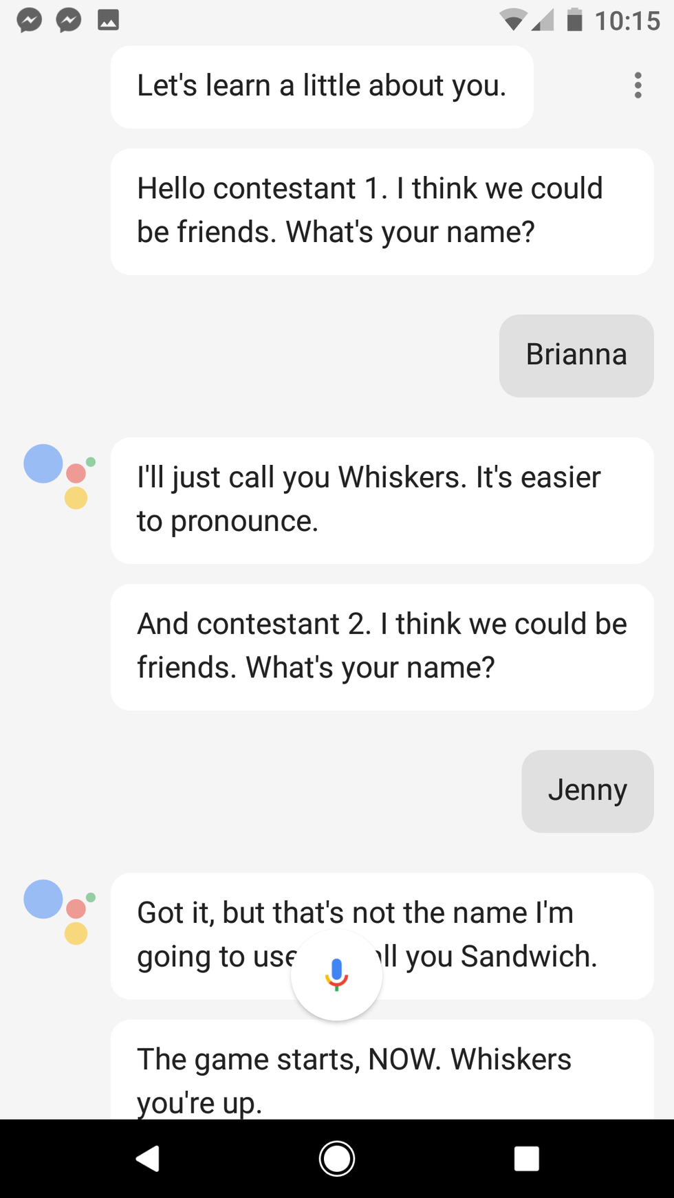 Well, they only got half of our names right (mine, luckily), but I was dying of laughter with Google Assistant's cute way of giving us different nicknames in the duration of the game (where was that humor in the first category Google Assistant???). Unfortunately I do take offense to the blatant disparity in question difficulty between Sandwich and Whiskers.