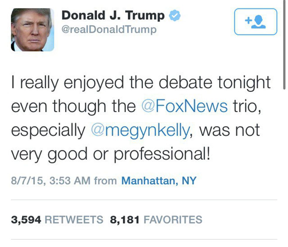 He's been the talk of the country and Thursday night he was determined to keep it that way. He was the candidate with the most talking time and some of the most memorable quotes. Although he isn't president yet, he has already declared war...on Megan Kelly. One of the most talked about moments from the night was when she asked a question criticizing Trump for his "disparaging comments about women". His response was dealing with the idea that “the biggest problem this country has is being politically correct.” He didn't apologize for what had been said, but somewhat sarcastically apologized if she didn't approve of his comments. He has taken his disappointment to his Twitter account (oh goodness).