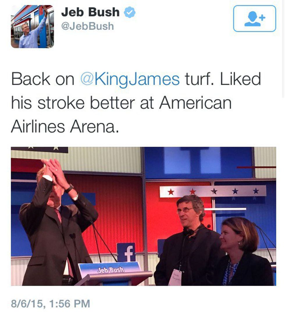 Jeb Bush didn't have an amazing night with several earth-shaking moments, but he also didn't have a horrible night full of mistakes. One of his questions dealt with his last name and some problems that come with that. He made sure to establish that he isn't his brother, isn't his dad, and he has his own plans for our great nation. He also caught some heat about his service with the Bloomberg Foundation. This foundation, at the time of Bush's service, supported and funded Planned Parenthood, which is under scrutiny by many conservatives and Americans for their actions. He was asked if he knew that the foundation supported Planned Parenthood and after avoiding the initial question, he answered saying he did not know because he was there to work on education issues. Although Bush didn't have any heated tweets directed towards Fox News or any of the commentators, he had a fun tweet before the debate, acknowledging he was in King James' arena.