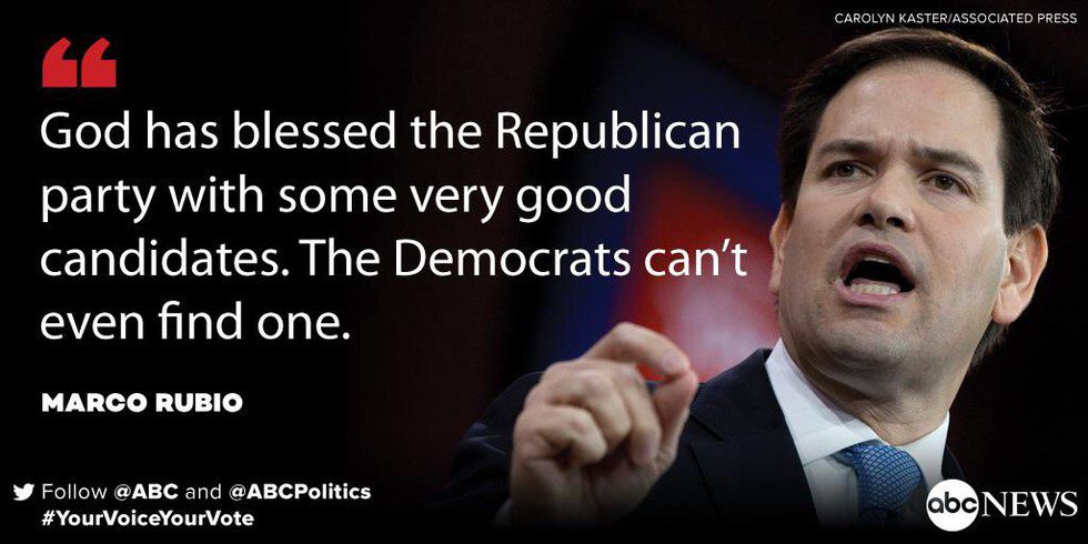 Marco Rubio, although he seemed a bit rehearsed, he also seemed inspiring, hopeful, fresh, and young. In his first few moments, he said "this election better be about the future, not the past." He wanted to make it clear that he is pro-life, always has been, and always will be. That the every human being deserves to have equal opportunity and "is entitled to the protection of our laws, whether they can vote or not, whether they can speak or not, whether they can hire a lawyer or not, whether they have a birth certificate or not." He was also very confident that his party had many great candidates, while the Democrats can't find one.