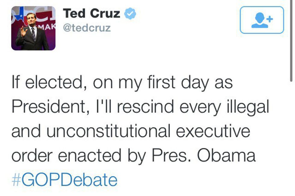 Ted Cruz was asked how he would defeat ISIS in 90 days. Wouldn't that be nice? Although he didn't give any concrete tactics or policy, he did criticize Obama for being a weak Commander in Chief. He said, "What we need is a Commander-in-Chief who makes clear: If you join ISIS, if you wage Jihad on America, then you are signing your death warrant.” He made it very clear that no matter who you were, if you were associated with these terrorists, Ted Cruz, America would be after you. He also made sure that the people of America knew he didn't just think that Obama was weak, but he was a president out of control with his power and "unconstitutional" executive orders.