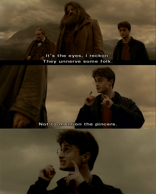 As Harry so eloquently puts it in the picture above, there are quite the pincers on Aragog and his descendants. Voldy could have gone wandering in the Forbidden Forest when he was in school, doing some dark things that budding Dark Lords do, when he came across the family of Acromantulas. Of course our wondrous Lord Voldemort would not lose his life to a simple family of overgrown spiders, however, he did lose his nose in the process. A battle scar to end all battle scars.