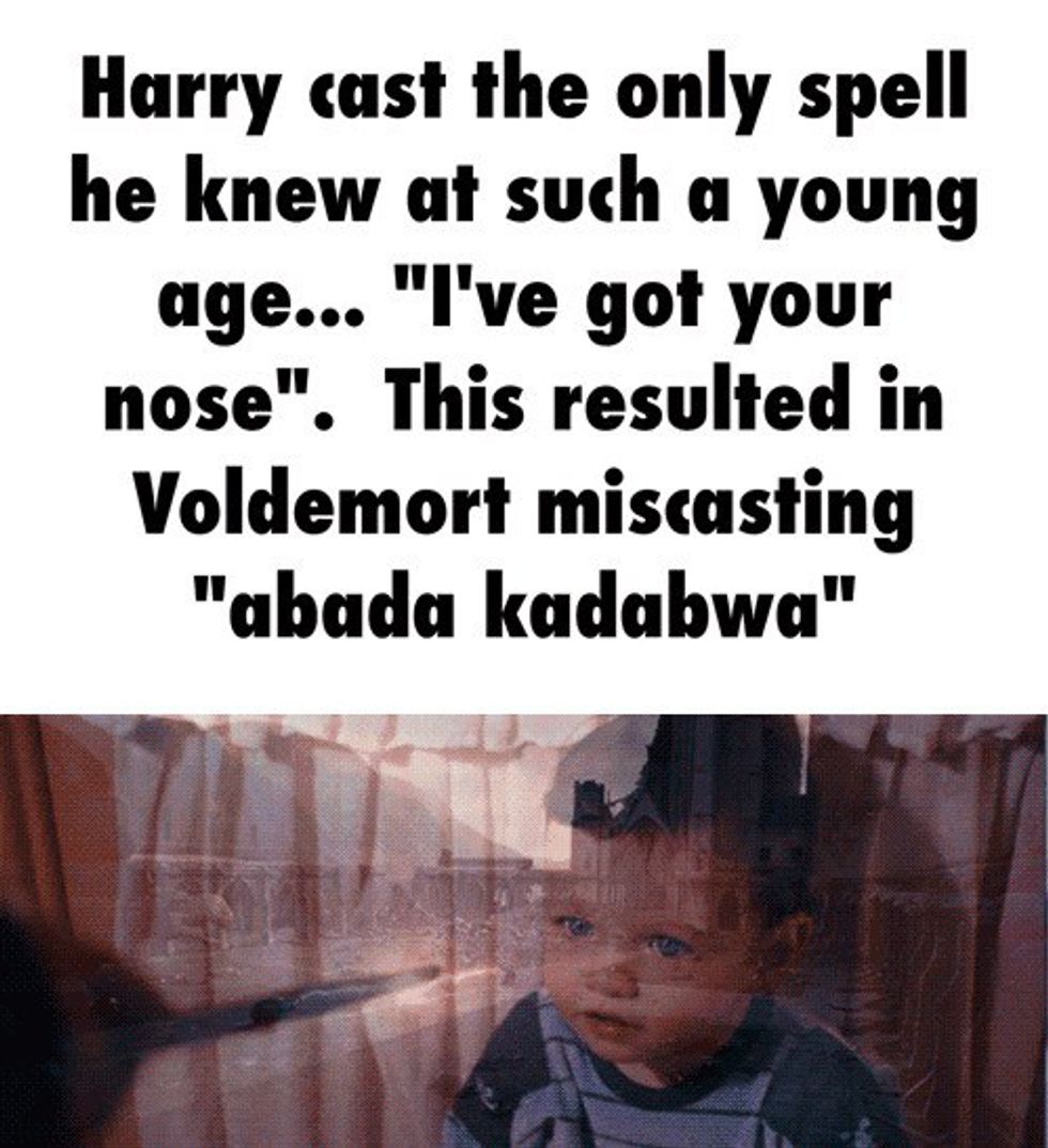 Whoops. Who knew that this kid would be the reason Voldy would lose his nose? Accidental magic would account potentially for this, if we ignore the fact that most kids only a year and a half old don't speak full sentences, but this is also the kid who remembers his parents dying and you know, is a wizard, so maybe conventional rules don't apply to him.