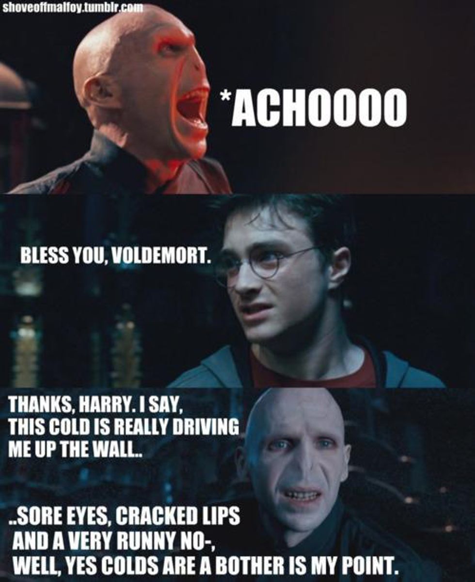 Ol' No Nose has plenty to do on his plate already, he has got to conquer the wizarding world, stomp out that pesky Light movement, cow a bunch of muggles, feed his snake, and make sure to stop for tea before cursing his followers into fearing him. Point being, this Dark Lord is busy, and does not have time to deal with a runny nose. Maybe Voldemort purposefully removed his nose, or had a follower do it, the fact of it is, is that Voldy doesn't have to deal with sinus issues like you and me. Really, who ever followed a sniffling villain anyways?