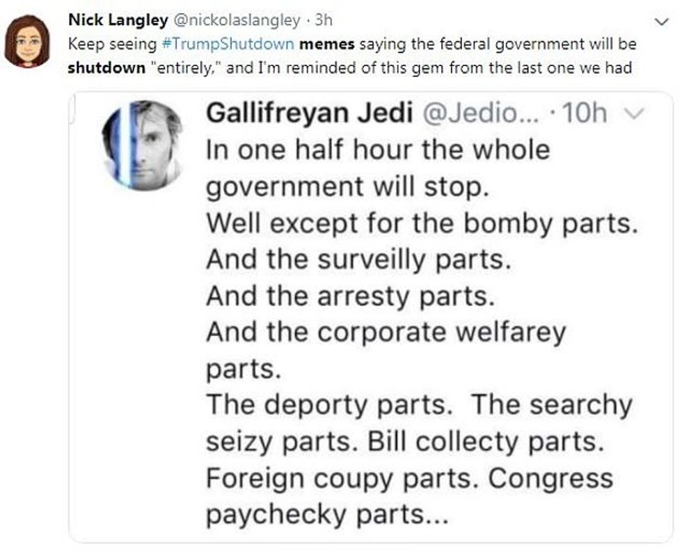 The longest partial government shutdown in history has been going on since December 22, 2018. Trump announced on January 25th that the government would temporarily reopen until February 15 in hopes of a return to normalcy, especially for government workers. From the moment Trump shared his opinion and officially shut down the government the internet has been eating it up. The best way to sum up the general population's opinion on the matter is by reading these hilarious memes.