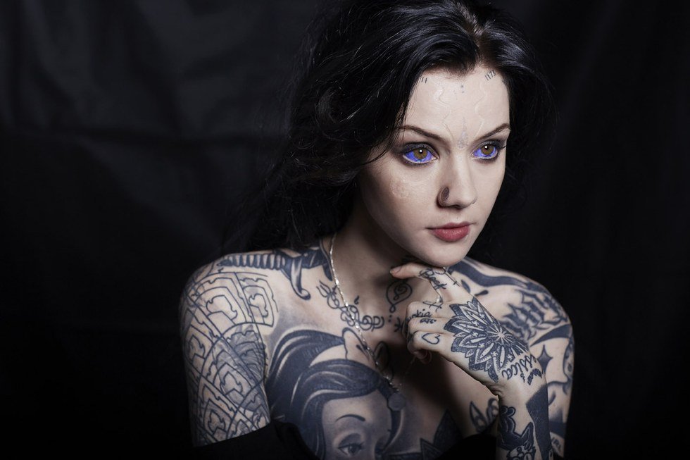 A woman from London. A tattoo covered tattoo artist/model/fashion designer who went on an artistic journey that led to her removing her belly button, and pointing her ears, and forking tongue her tongue, and scarifying her face, and plating her teeth, and plugging her nose, and tattooing her eyeballs along with a plethora of (regular?) tattoos.