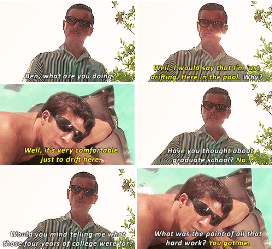 I have no doubt that most college students identify with Benjamin even after almost 50 years. None of us want to study for years just to be a stay at home parent. None of us want to go to school to be just another banker, or an insurance agent. I don't want to waste my time releasing passion into my work if it's going to be subjected to people who see me as just another set of hands.