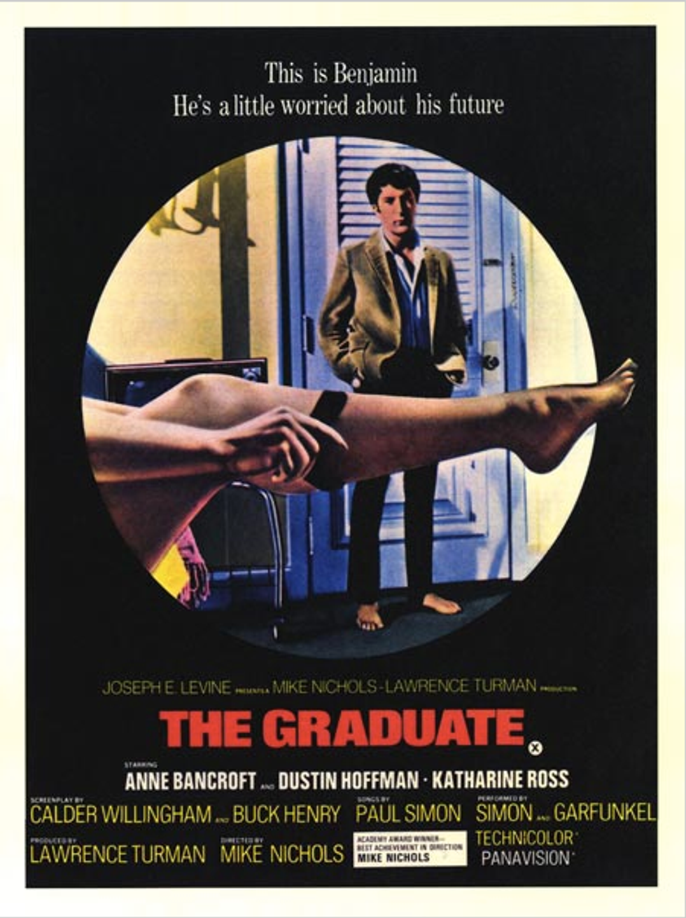 The movie needs no introduction, but if you've been living under a rock it goes like this: Benjamin graduates from college and comes home to a parade of adults asking, “What will you do now?" and the character is frozen for months within the realization that he has spent years studying and earning a degree just to float along with the ebb and flow mainstream culture pulls all young graduates into. He lacks direction, passion, or perhaps a lack of passion due to an absence of his own direction. Anyhow, he becomes more and more obscure in his behavior and is seduced by Mrs. Robinson (you know the song) and then, later, runs off with her daughter.