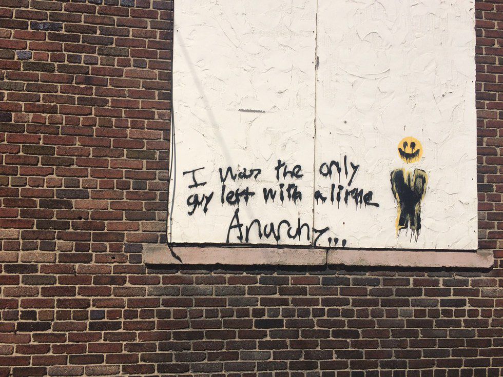 And in my hometown, I saw this piece of graffiti that reads "I was the only guy left with a little anarchy..." (Even though, yes, it looks like it says "lime anarchy," and not "little anarchy," and that's funny and all, but you get the point.)