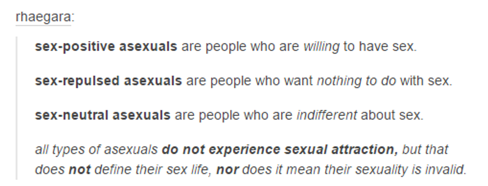 You have three different forms of asexuals when it comes to sex drive alone. You have Sex-repulsed asexuals, who are disgusted and have no desire to engage in sex. You have sex-neutral asexuals, who do not have positive or negative feelings towards sex, they simply don’t seek out to engage in sex, though they may engage in it at some points. And then you have sex-positive asexuals, they believe that it is healthy and normal to engage in sex, and even though they engage in it, they don’t really have sexual feelings/attraction towards others. Then you have different forms of asexuality, such as: asexual, demisexual, gray asexual, lithosexual, etc.