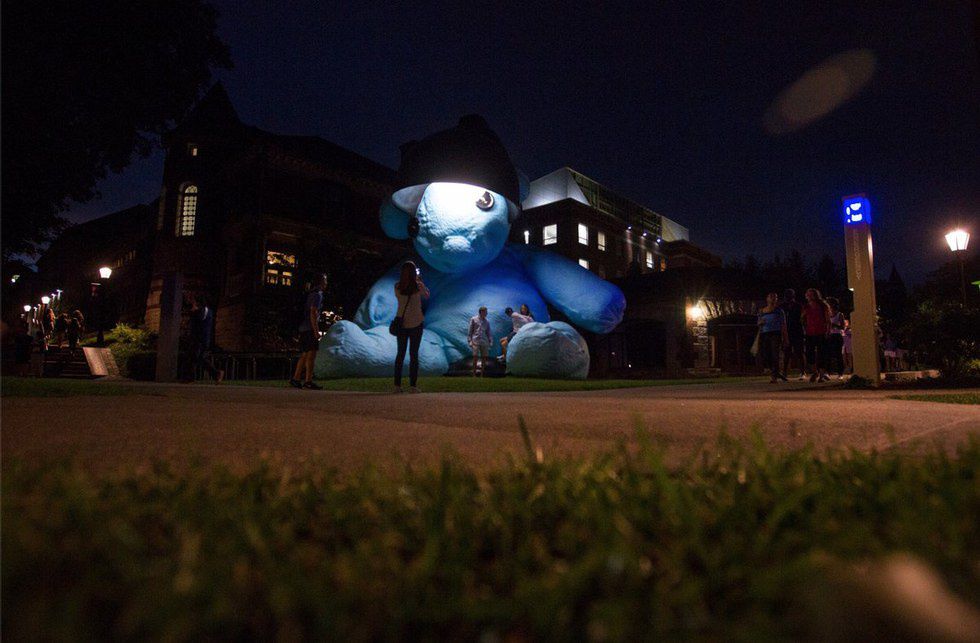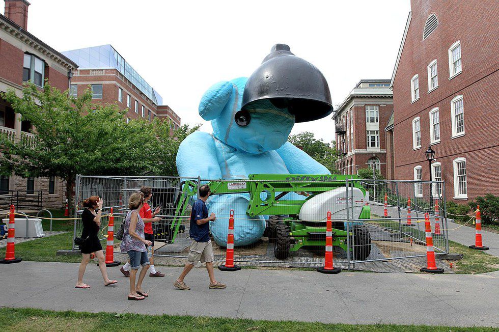 See that woman on the left looking up at the sculpture? We have caught her in the midst of this very thought: the confusion that envelopes one upon the sight of a twenty-three-foot teddy bear sitting in the midst of classy looking red brick buildings on an Ivy League campus. It seems out of place--assuming, of course, a creation of this sort has a place to begin with.
