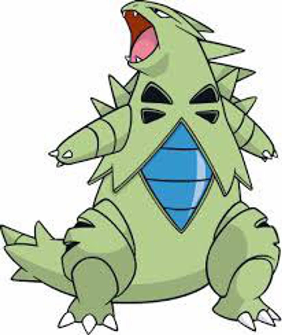Tyranitar is exactly as his name implies: A giant dinosaur Pokemon with very thick plated armor for scales on his body. His back and shoulder blades have jutted out plates, and the center of Tyranitar's chest is a diamond shaped silver grouping of scales. Tyranitar looks tough and intimidating, and has a very Godzillaish appearance.