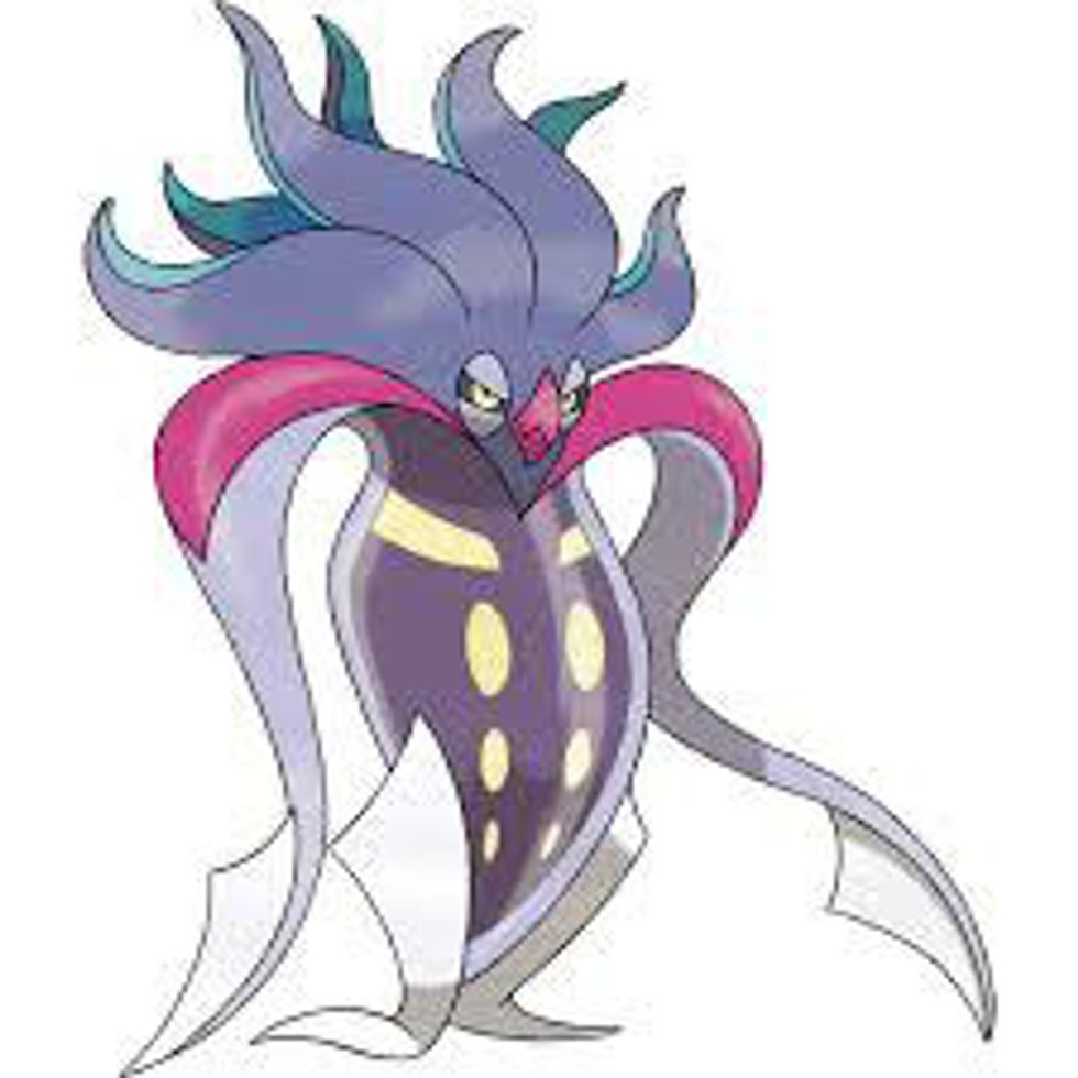 Squid-like in design, Malamar expresses the feeling and overall look of most real-life deep sea creatures. Malamar looks like an upside down squid, where what would normally be the body, now acts as the lower torso and legs, and where the squids tentacles actually act as both the head and as the hair. The bright red beak and glaring eyes work really well with the dark torso, which contains six circles and two lines that are a flourescent yellow color.