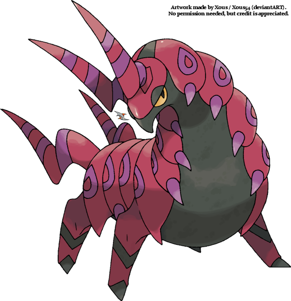 Scolipede is basically what you get when you combine a centipede with a horse. The colors Scolipede consists of: red, black, and magenta, work really well here and makes Scoliopede stand out. The eight poison barbs on his torso look threatening, the antenna on its head, and horns on its rear also work really well with the rest of its body.