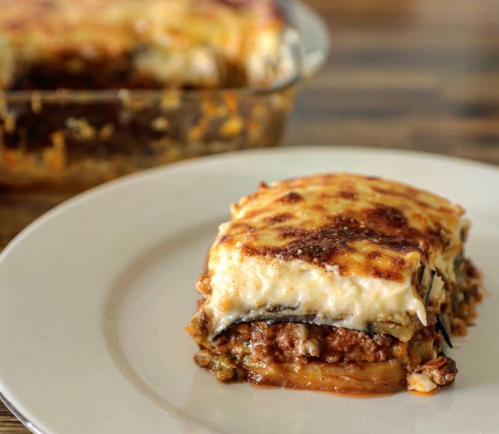 Sautee onion in half the butter until transparent, about 10 mins. Add ground sirloin, salt and pepper, cinnamon and nutmeg, cooking gently for 15 mins. Add tomatoes and wine, coking over medium heat, covered for 25 mins. Remove frm heat. Slice eggplant, zucchini and potatoes about 1/2-inch thick and brown slices on both sides in olive oil. Butter a 3 inch deep, 10x12 baking dish. Put in a layer of 1/3 veggies, then a layer of 1/2 the meat mixture, and sprinkle with parsley and cheese. Repeat layers, ending with a layer of veggies. Mix remaining butter and flour (butter not melted) in a heavy saucepan and cook over low heat for 10 mins. Stir in milk, eggs and cook until thickened. Pour sauce over top and bake in a 325F oven for 45 minutes until vegetables are tender.