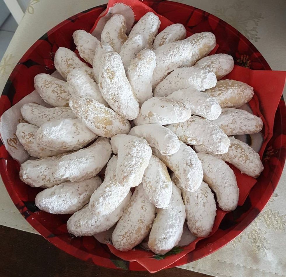 Melt butter and cook for a few minutes until salt settles to the bottom (about 10 minutes). Pour off clear butter into a mixing bowl, leaving the salt. Cool in refrigerator. Beat until lemon-colored. Gradually add sugar; add egg and beat well. Continue beating and add flavoring. Add flour, cinnamon and cloves at low speed. Mix in nuts by hand; knead about 5 mins. Shape into desired forms, or cut with cookie cutter. Bake at 300F, 45 to 55 mins. Cool and cover with sifted powdered sugar.