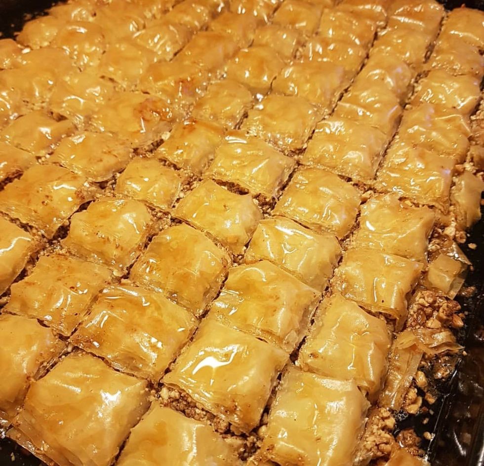 Thaw phyllo in refrigerator overnight. Unroll phyllo and place onto damp dish towel. Cover with another damp towel. Melt the butter. Mix nuts, sugar and spices together. Brush the bottom and side of a 13x9x2-inch pan with butter. Place first sheet of phyllo so it covers bottom and sides with excess over sides. Brush with melted butter. Place second sheet of phyllo in pan, folding so it fits; brush with butter. After every 2-3 sheets of phyllo, sprinkle with nut mixture. Continue until all of nut mixture is used and two sheets of phyllo remain. Fold the phyllo from the first sheet over the mixture. Place the last two sheets of phyllo on top, buttering each. Using a razor blade, score the pastry and bake at 325F for 45 mins. Dribble the syrup over the hot pastry.