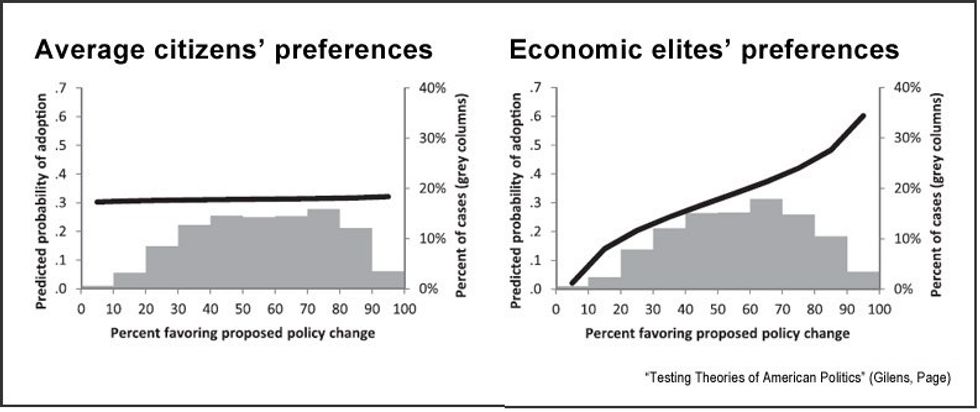 The central point that emerges from our research is that economic elites and organized groups representing business interests have substantial independent impacts on U.S. government policy, while mass-based interest groups and average citizens have little or no independent influence...not only do ordinary citizens not have uniquely substantial power over policy decisions, they have little or no independent influence on policy at all...our results provide substantial support for theories of Economic-Elite Domination.