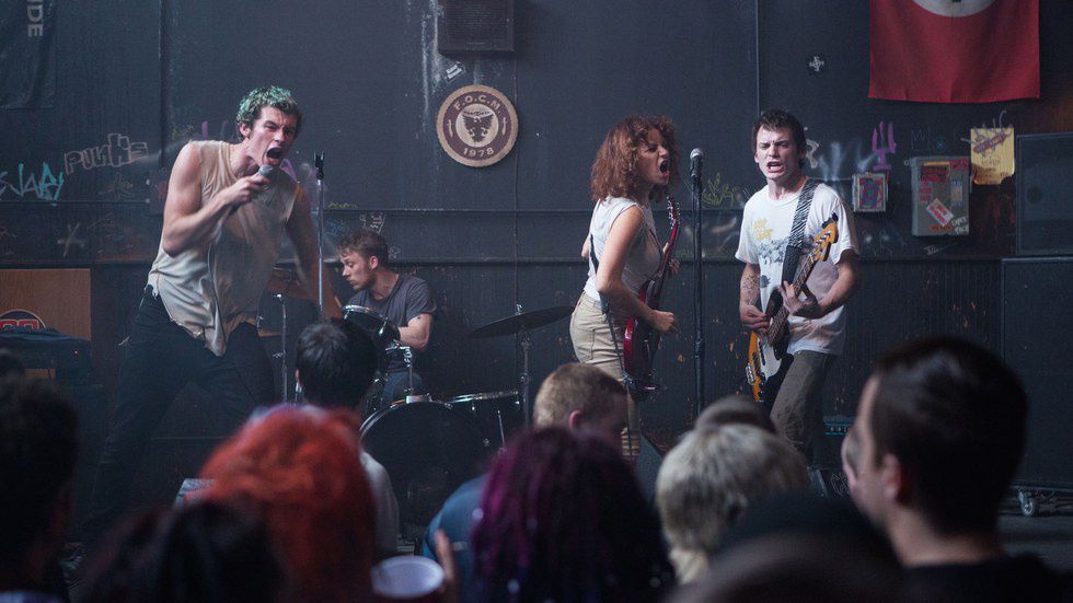 Saulnier begins on an appropriately quiet note, taking the time to establish the dynamics between the band members before they find themselves at the mercy of the racist skinheads. There is also a bit of clever foreshadowing during these first few minutes, including a brief moment where Pat (Anton Yelchin), the bassist, washes Sharpie markings (left by his bandmates as he slept the night before) off his face. The band's punk status is cemented as they facetiously perform a cover of the Dead Kennedys song, "Nazi Punks F**k Off." It's the only sequence of "enjoyable" tension before Saulnier really nails us into our seats.