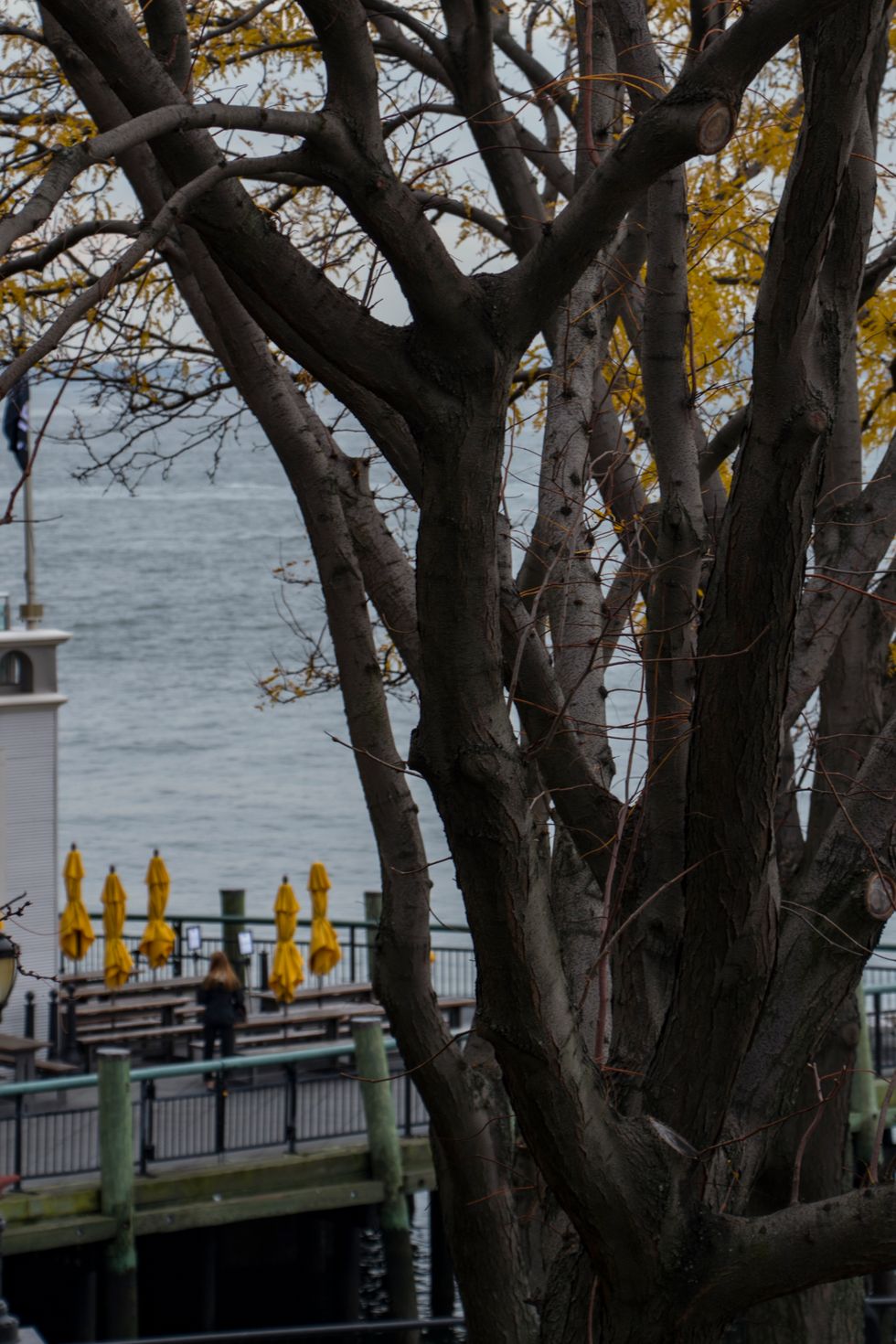 Yellow leaves and yellow umbrellas are framed as two sides of the same picture.