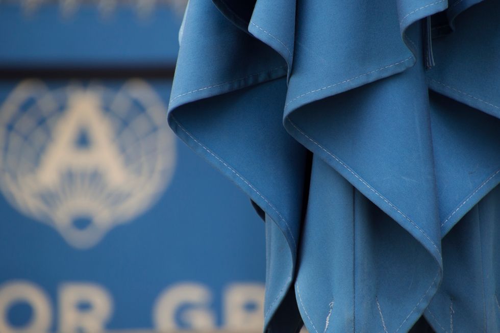 The folds of a blue umbrella, set against a restaurant banner, highlight the texture of the fabric.