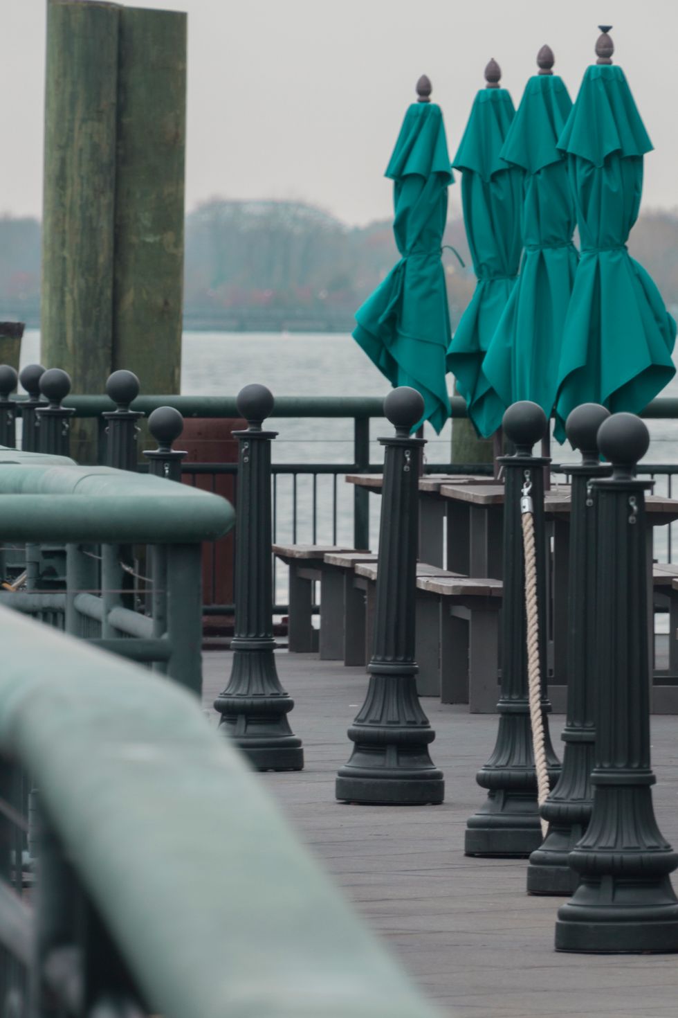 Umbrellas the same shade as oxidized copper stand mirroring the bollards of a restaurant.
