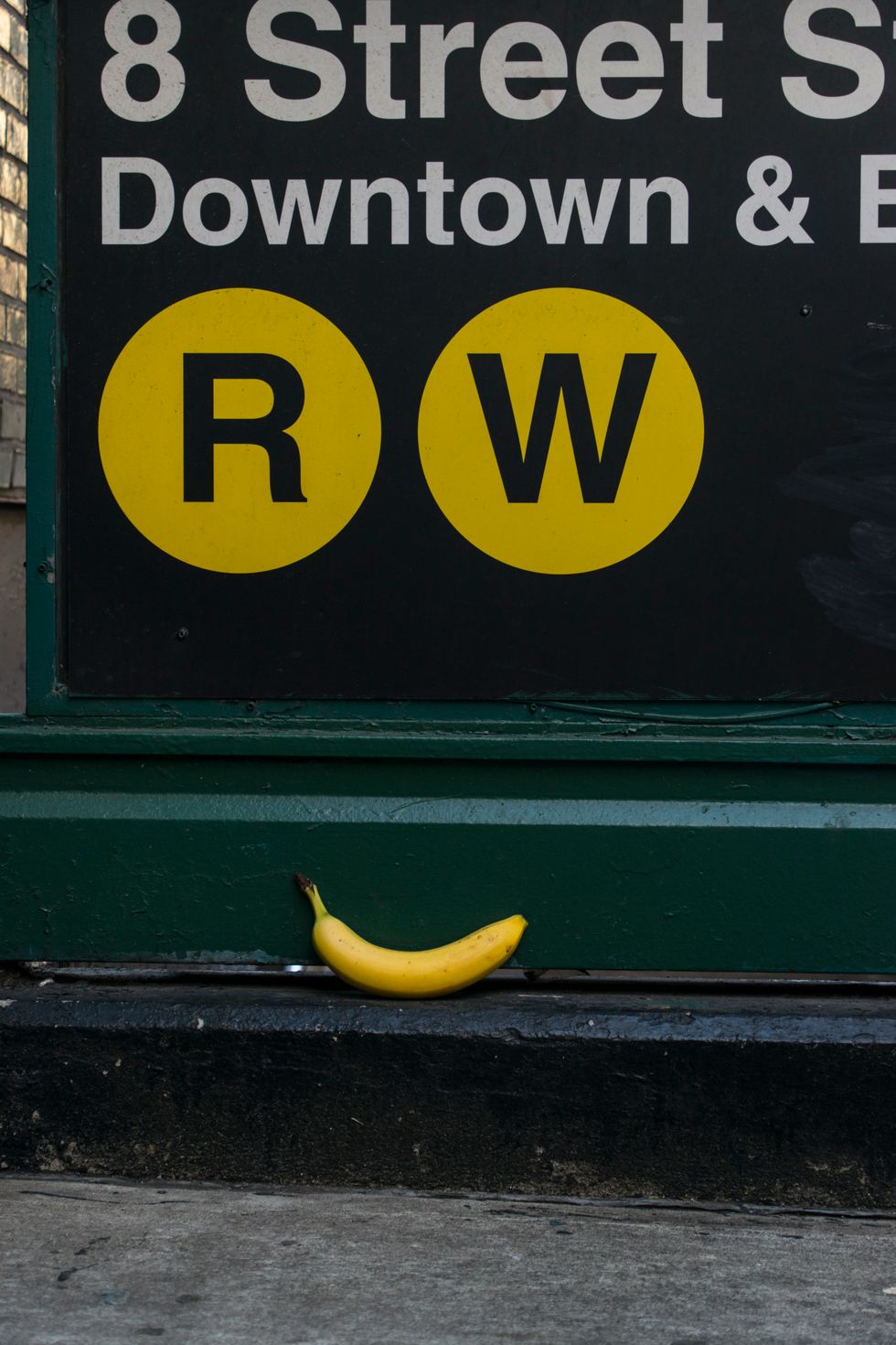 The symbols for the R and W trains overlook a found banana