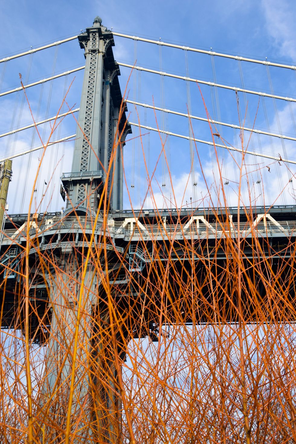 Dogwood branches obscure the support and underside of the Manhattan bridge