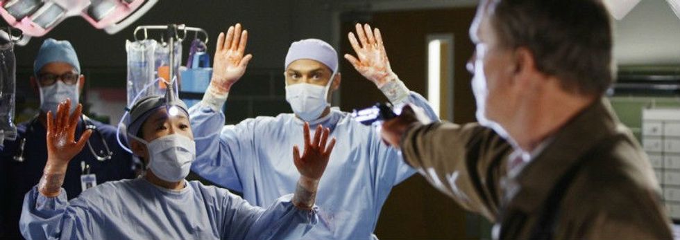 Dr. Cristina Yang and Dr. Jackson Avery are in the middle of operating on Dr. Derek Shepherd, one of the shooter's victims, when he enters the operating room to stop them from saving Derek