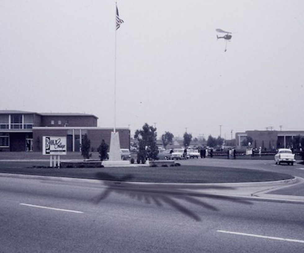 Biola, back in the 60s, was still a college, not a university. This photo not only captures the helicopter's flight over campus dangling the egg, but also captured the griffin's shadow, presumably in pursuit. Very little is known about the photographer, or the organizers of the griffin egg's premature flight.