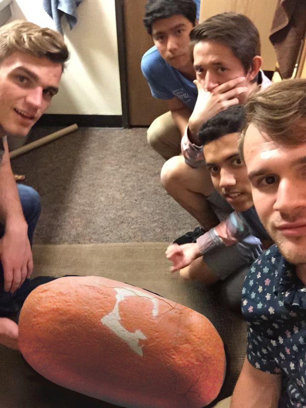One of the traditions of the egg that has sadly been lost to history was the necessity that the egg be displayed on campus once a month to at least half of the student population. This resulted in several ludicrous situations. Don Hoffman recalls when he and a group of his friends wheeled the egg through chapel on a hand truck, resulting in a mass exodus of students in pursuit, much to the confusion of the poor guest speaker.