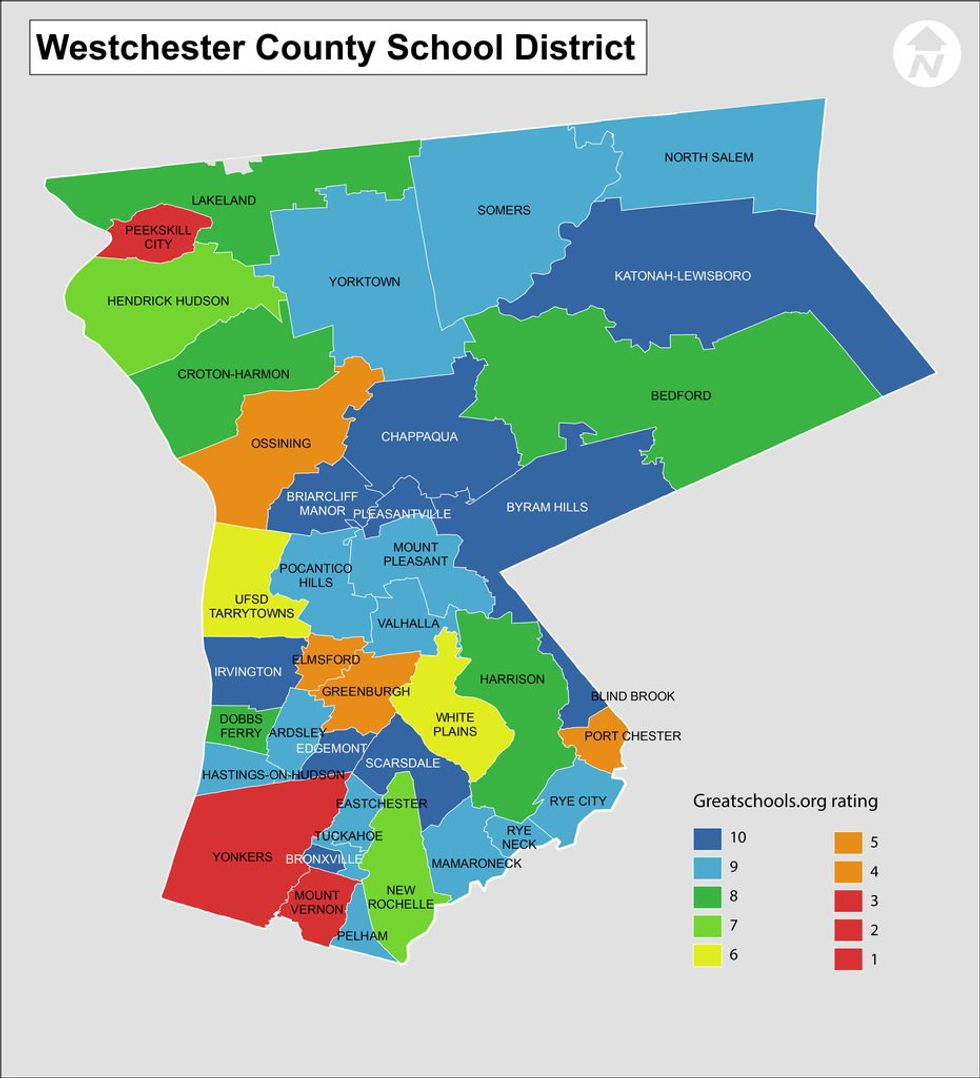 Yonkers, New Rochelle, Mount Vernon, Peekskill, Bedford, Rye, Yorktown, New Castle, Scarsdale, Ossining, any of the six villages in Greenburgh along the Hudson, Eastchester, Harrison, Lewisboro, Mamaroneck, Mount Kisco, Mount Pleasant, North Castle, North Salem, Pelham, Pound Ridge, Somers.