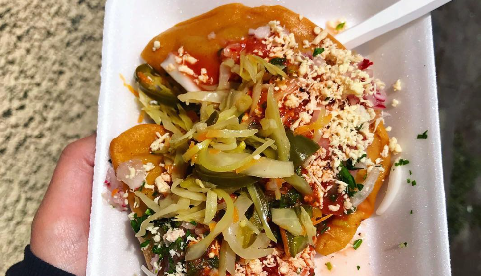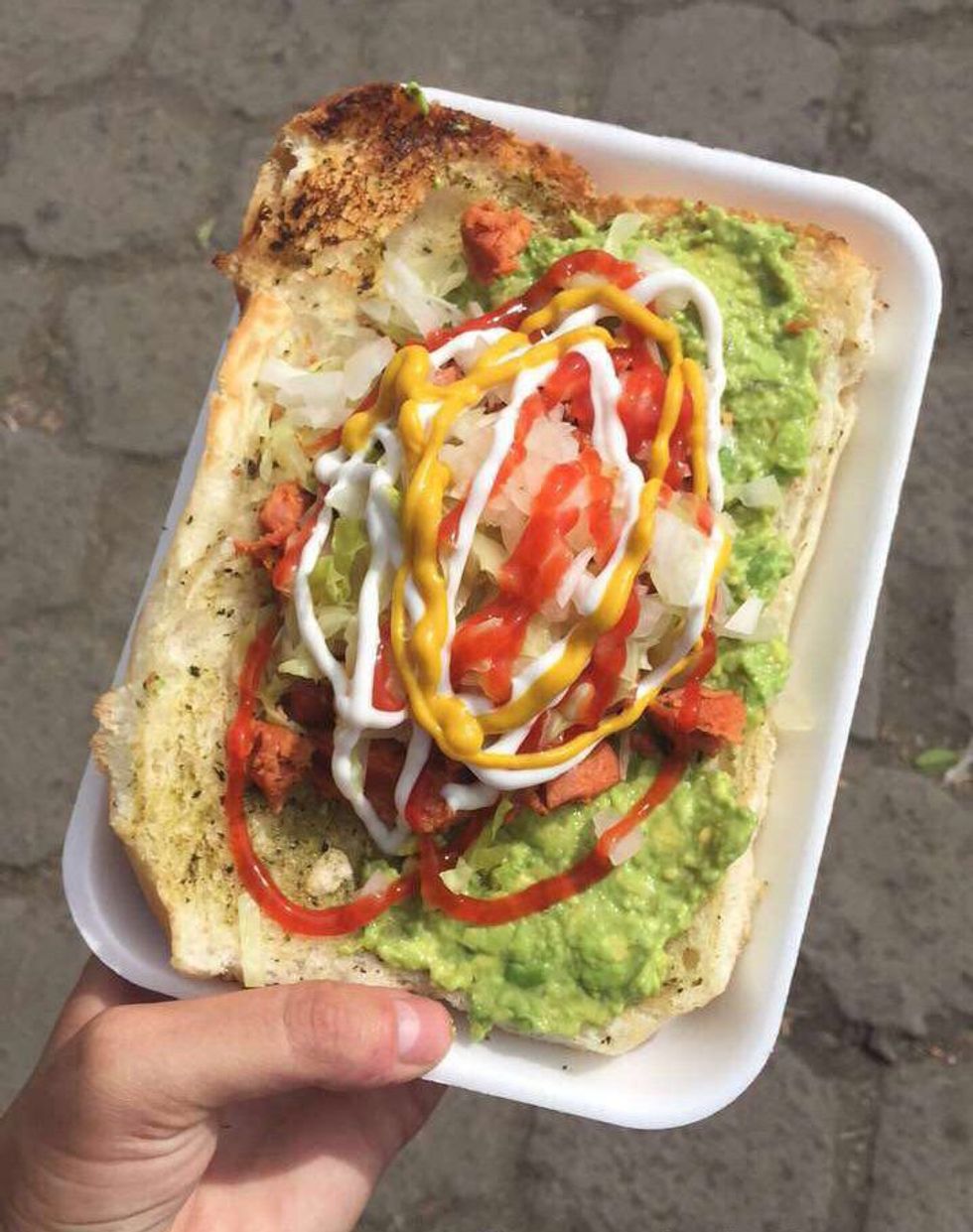 Translates to "dirty bread" but is the complete opposite. This sandwich is a street food that has spread guacamole, hot dogs, ketchup, mustard, mayonnaise, and cabbage on a toasted roll. Basically just a hot dog with extra toppings.