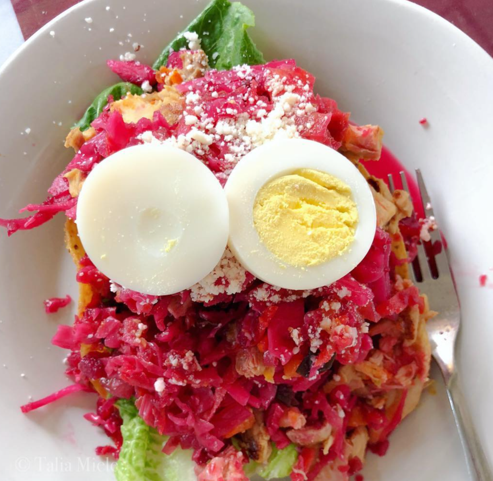 Not to confuse with Mexican enchiladas. These enchiladas are served as a tostada that is topped with ground beef, sliced beets, lettuce, Guatemalan cheese, carrots, and a boiled egg on top. Really messy but bursting with flavor.