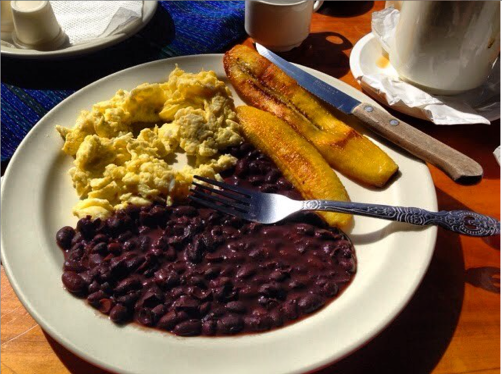 Something simple and filled with lots of protein. Scrambled eggs, beans, and a plantain.