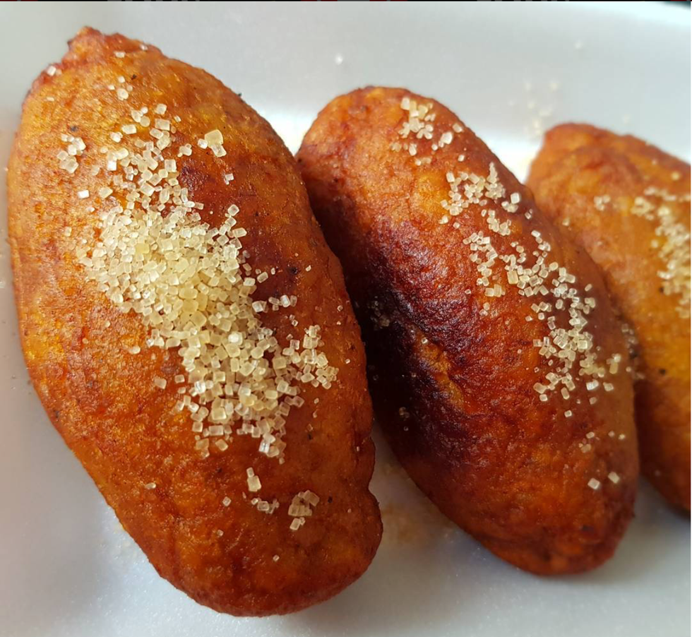 A Guatemalan dessert that is molded from squished plantains. It comes with a sweet gooey bean paste inside and sprinkled with sugar and