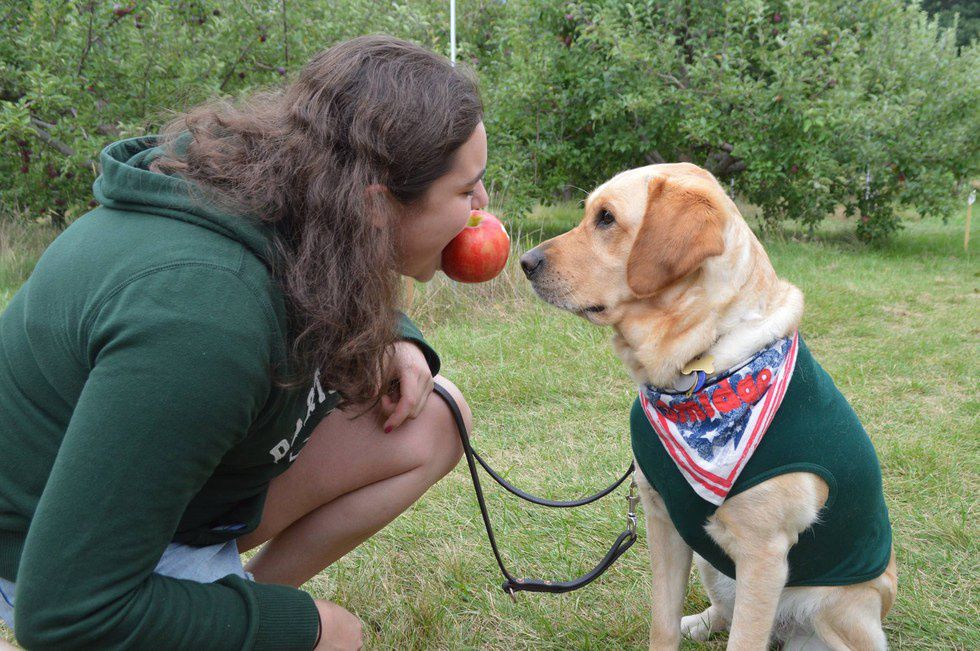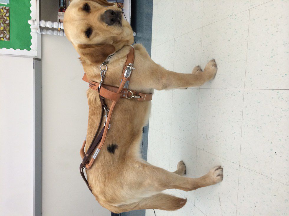 My guide dog, Smidge, is kind of a celebrity at Dartmouth. Somehow Smidge has managed to accumulate exponentially more friends than I have in the two years we have been in Hanover. Her puppy dog eyes and wiggly butt really seems to elicit happiness from almost everyone she comes into contact with. I was matched with Smidge, a 4 year-old Labrador golden retriever mix, by the Guide Dog Foundation for the blind in April of 2014. She has a small “smidge” of black on her right hip, so that’s how she got her name. Smidge is a great dog. In her eyes, her soul purpose in life is to make sure that I am safe, and for that I am eternally grateful to have her. She is an extra pair of eyes when I fail to see parts of the world around me. Smidge has given me the independence I have always wanted without ever leaving me to do things alone. She would do anything to keep me safe, and even when she is off-harness and “not working” she is always trying to use her vision to make up for my lack of vision. Watching Smidge do her job is amazing and it is understandable that seeing a service dog often elicits questions. Here are a few of the most common questions I get asked about Smidge.