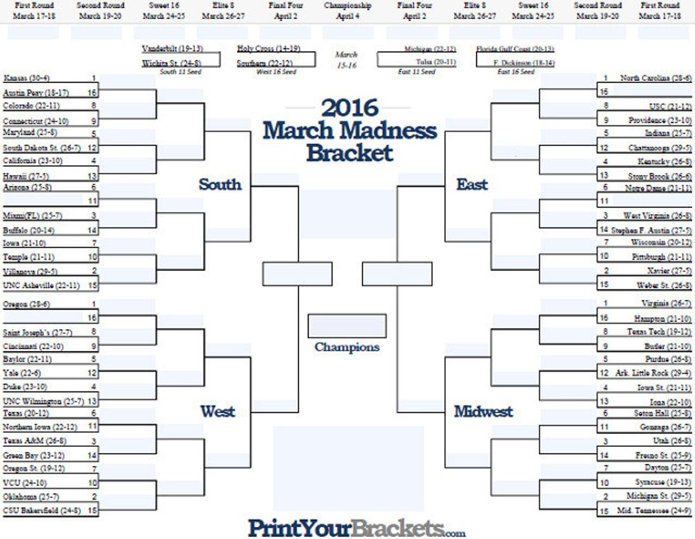 It’s OK if you haven’t watched any college basketball this season or if you don't know anything about basketball, March Madness can still be an exciting time for you. You’ll be hearing about this tournament for about a month now, so you might as well participate! The teams seeding is there to give you an idea of how the teams are going to do (or how they are supposed to do). This can help you fill out the bracket if you haven’t watched any of the games this season. Another thing that you should note is that there are 68 teams at the beginning of the tournament and as soon as they lose, they are done. The 68 teams are lumped together into four groups of 16 teams, by their region. These regions include East, West, Midwest and South. If a team wins the first game, then they move onto the Second Round, the next round is called the Sweet 16, then the Elite 8, the Final Four and finally the Championship. Now you may be thinking how did the NCAA picks these 68 teams, there are definitely more than 68 Division I basketball teams. Well the 32 teams that won their respective conference make it. Then the NCAA pick the rest on a day called Selection Sunday. The way the NCAA decides who they pick is based on records and who they have beaten throughout the season.