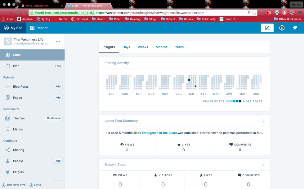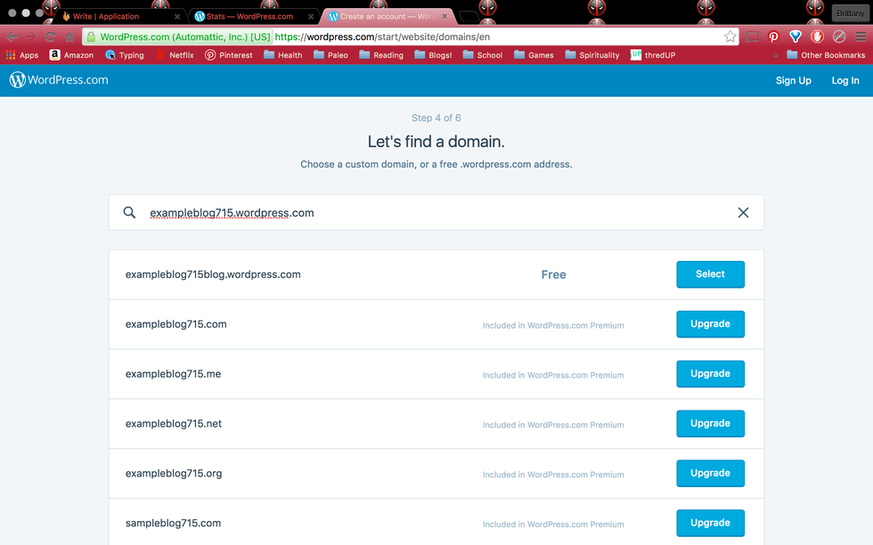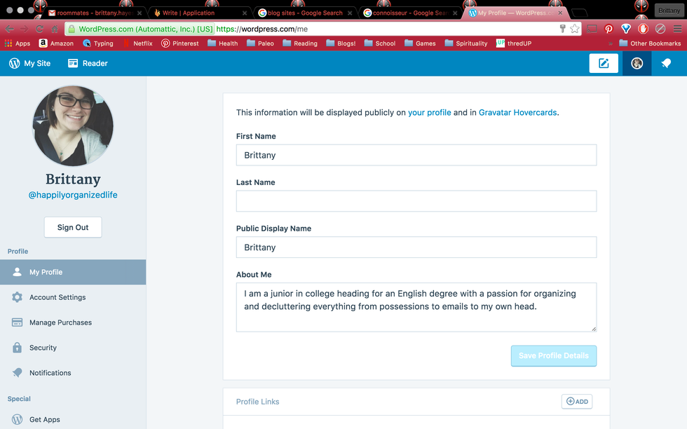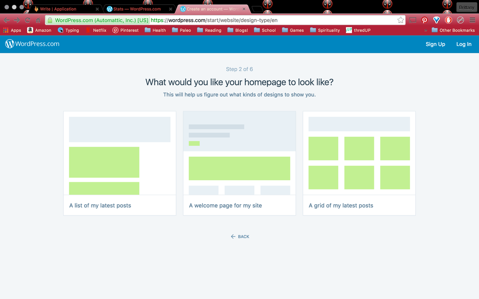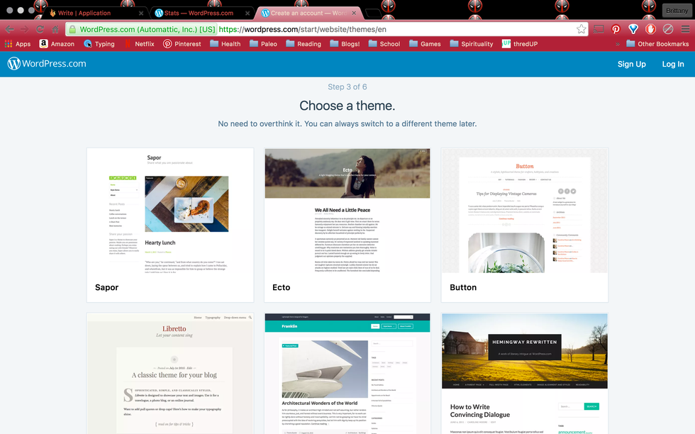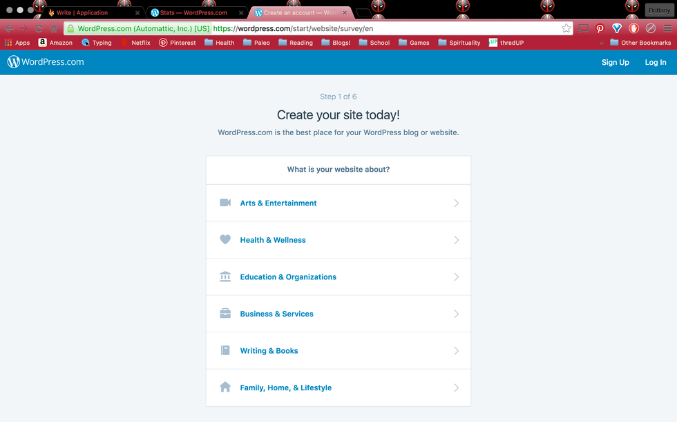 First do some research into the different sites. Wordpress, Tumblr, Blog.com, Blogger, Medium.com, Penzu, and Weebly just to name a few. You will want to think about what kinds of things you will be sharing with the world. If you are an artist and will be sharing visuals of your artwork or your music, Tumblr is a better choice for you. If you will be doing more writing, then Wordpress or one of the others would be a better fit for you. I went with Wordpress because it was the least intimidating to me.
