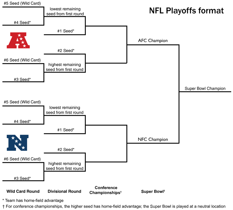 The New England Patriots went 11-5 in the regular season en route to a tenth straight AFC East title and ninth straight first-round bye. The Patriots won the AFC side of the playoff bracket by beating the Los Angeles Chargers in the Divisional round and the Kansas City Chiefs in the Championship round, who both finished the regular season 12-4. This resulted in a third straight Super Bowl for the Pats, after an eighth straight AFC championship game appearance.