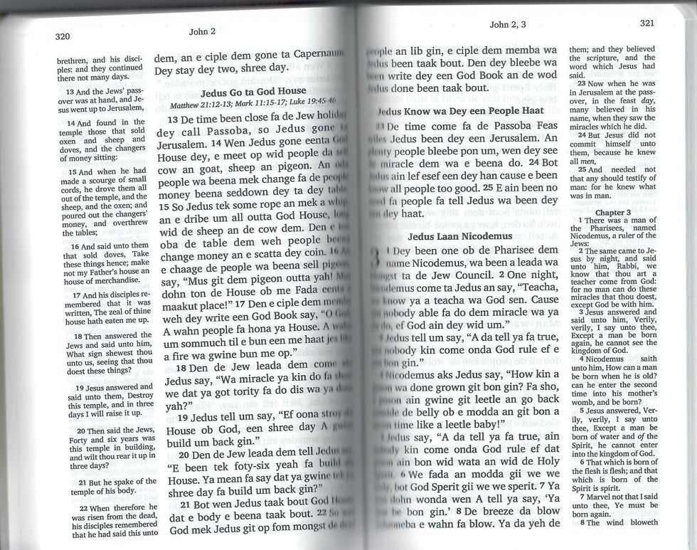 But, even with all of these grammatical rules and African-origin lexicon, it still might be looked upon as a dialect; even the title of Dr. Turner's book calls Gullah a dialect. What makes a dialect different from a language is that although a dialect consists of its own variation of grammatical rules and lexicon, a language is a system of communication that develops independently from the other dialectic variations of the same language for political or geographical reasons. In the case of the Gullah language, it developed in isolated parts of the American colonies. As seen from the Biblical passage above, it also has a slight degree of unintelligibility, making it distinct from any American English dialect (which is also why there are English translations on the fringes of the pages).