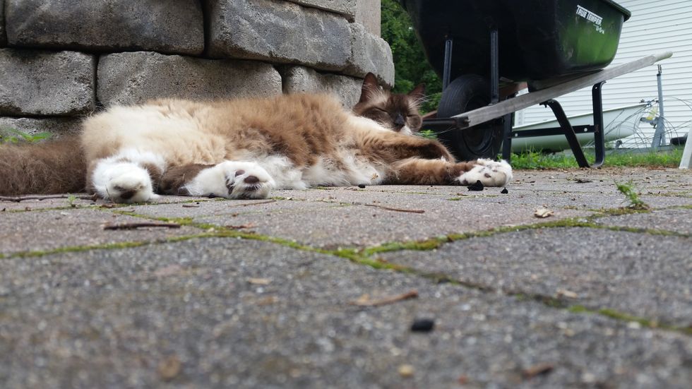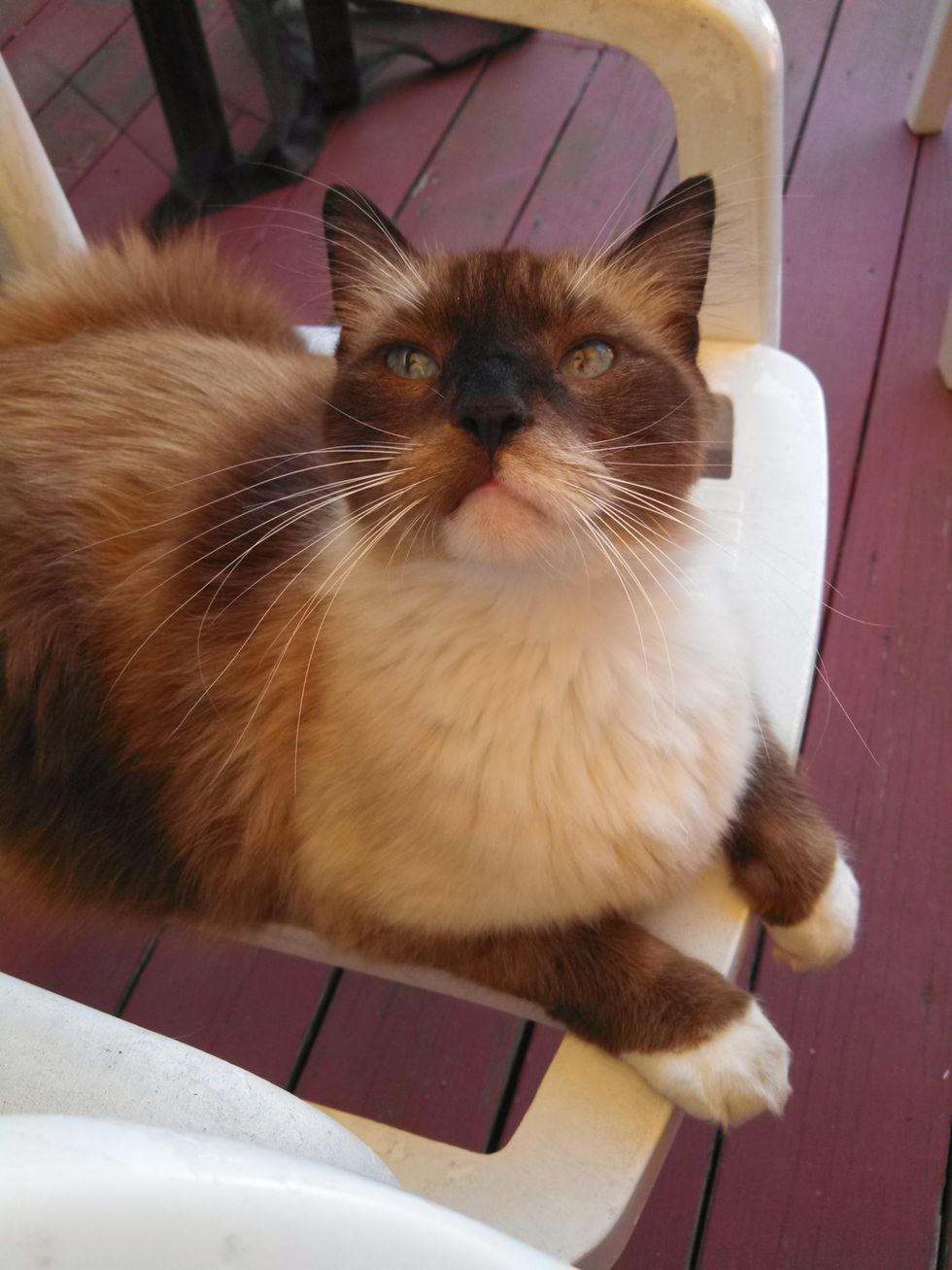 I can still remember when he was a ball of white fluff and he crawled up on my dad’s back, sitting content on his shoulder. I remember when we had an old refrigerator and the curiosity closed in on Gus and he stuck his head between the door and the shelves, my mom didn’t realized and closed the door on him. I remember him laying in my room and I laid my head against his stomach, knowing that my heart hurting was love. I remember when I came back from Europe and he was laying on my suitcase and I laid next to him, sleeping. He would roll outside and come trotting back in with burrs stuck to his fur. We would worry when he would be out late at night because we could hear the fisher cats. He would sit proudly by the latest kill, a small mole or rat. He would spread the fleas across the house. He sat at the edge of the patio, looking over the expanse of the yard. I would see him running up when we came home and called his name. He would lounge in my neighbors gazebo.
