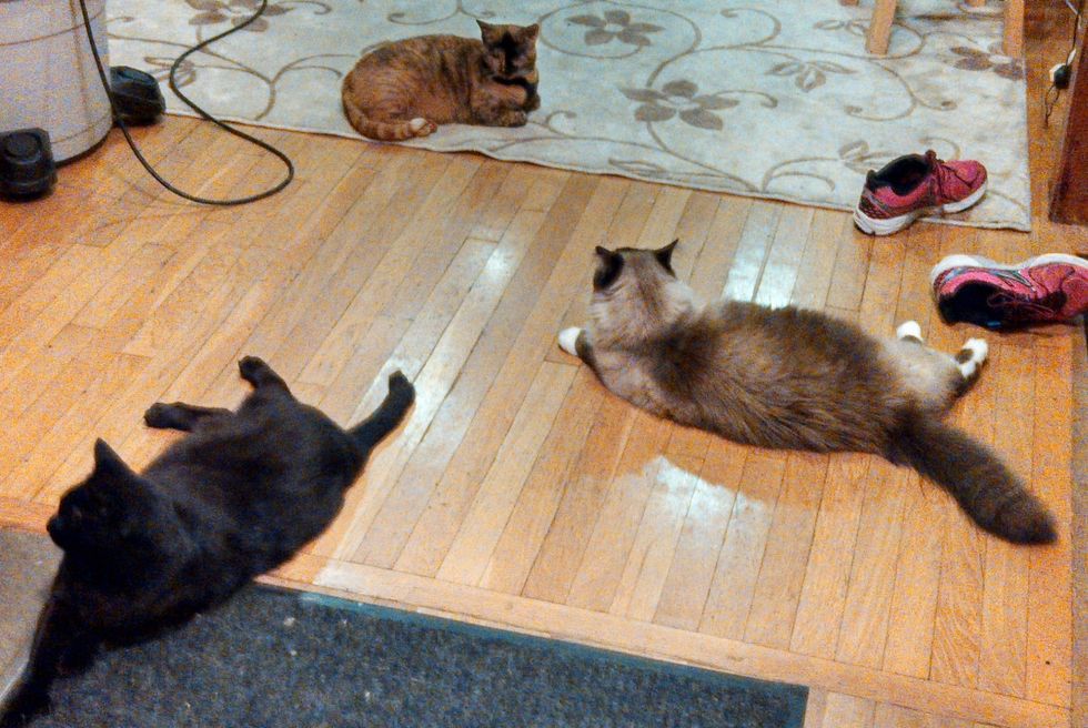 We eat mostly in silence, my mom’s boyfriend telling a story of how he was trying to get his backyard cleaned up. My mom offered descriptions of the brush that coated the dead grass. I keep my head down. Midnight hollars, brushing up against my chair leg, green eyes begging for turkey. I give him a piece and he bites it tenderly from my fingers. Sensing that Midnight was getting something Addie isn’t, she comes up but remains a short distance away as Midnight is very protective over his food and will eat everything. I click my tongue for her to come and give her a smaller piece on the other side of my body. Midnight tries to nudge his way to steal her treat, but the smaller cat has already snatched her piece and backed away, chewing furiously.